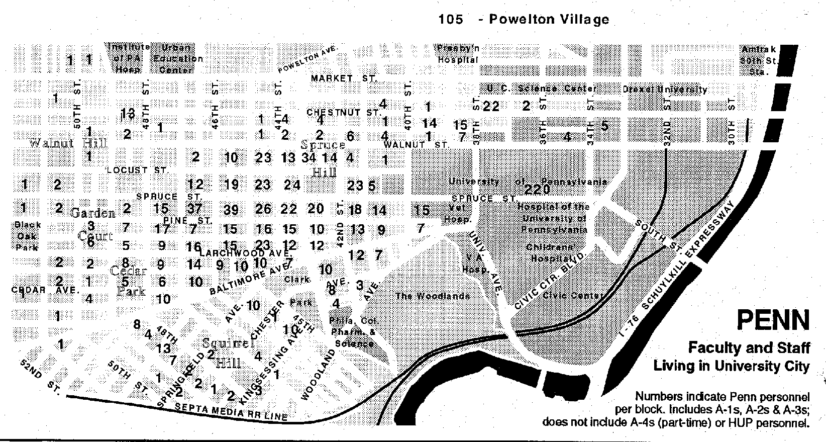 With crime, poverty, trash, homelessness, panhandling, and decline of the built environment encroaching upon their campuses, urban universities across the United States are recognizing that they must embrace and revitalize their surrounding communities or risk failure of their educational and research missions. The various threats of urban life, real or perceived, are causing students, faculty, and staff to consider carefully their commitments to urban life in and around major urban campuses. In response, colleges and universities are implementing major neighborhood revitalization projects as a way of reassuring these constituencies of their long-term interests in these vulnerable areas. The University of Pennsylvania is no exception to this trend. As Penn moves toward the year 2000, it is clear that without stable, viable neighborhoods in the areas immediately north and west of the University, Penn faces a cycle of decline that will be difficult to reverse. The fates of Penn and its surrounding communities are thus inextricably intertwined: it is in the University's institutional self-interest to work towards neighborhood revitalization in both University City and, by extension, West Philadelphia as a whole. Moreover, severe financial limitations placed on Philadelphia's city government make it incumbent on Penn, as the empowered player in these areas, to take a leadership role in mobilizing resources for revitalization. The University has done much in this field in the past, but it must do more, and do it with renewed energy and focus, if it is to meet the challenge of survival beyond the year 2000. Penn Faculty and Staff for Neighborhood Issues (PFSNI) is an organization drawn from the over 4000 Penn people who reside in these neighborhoods. Its goal is to help the University focus and apply its considerable resources to preserve and sustain these neighborhoods for generations of Penn people to come. In April 1993, over 500 Penn faculty and staff signed a petition calling for Penn to make "the well-being of the communities surrounding the University among the highest priorities of the institution over the next ten years." This document gives that priority meaning by calling for specific action and inviting further discussion and dialogue. Most of all, it seeks a cooperative, mutually sustaining relationship between Penn and those members of the Penn "family" who live, work, and raise their families literally within the shadows of the University's core campus. If the University is to retain the confidence of this important constituency, it must act decisively to implement the action steps set forth in this Plan.