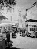 At left: Market Day in St. Remy by Elaine Moynihan Lisle reflects the local color and scenery of her recent trip to Provence. Other oil paintings shown include Philadelphia cityscapes.