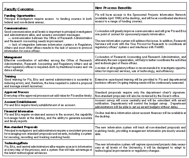 The benefits listed above will be the results of improvements to the process made in response to the faculty survey conducted by the Team. Of the 1266 identified active investigators, 341, or 27% responded. Because of the strong response and its correlation to information collected in faculty focus groups, the Team is confident that the table below represents faculty concerns and their solutions.