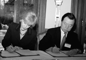 For Korean Studies at Penn: A $5 million commitment was made last week when President Judith Rodin and Ambassador Joungwon Kim--who also heads the Korea Foundation--signed an agreement for the University and the Foundation to endow professorships in Korean Studies. See On the Cover. Photo by Jake Wong, courtesy of The Daily Pennsylvanian.