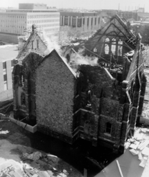 The destruction by fire of the Asbury Methodist Church closes a chapter in the history of the University of Pennsylvania's neighborhood. Before trolleys crossed the Schuylkill, Hamilton Village was developed by the Hamilton family to take advantage of the proximity of their estate to the Market Street bridge. Sites were given to various religious denominations by the Hamilton family in the hope that the presence of those institutions would encourage families to buy and build in the wilds to the west side of the Schuylkill. Asbury Methodist Church was founded in 1844 and soon built a church on Chestnut Street. Named for Francis Asbury, the circuitriding 18th century preacher, it quickly became an important institution in the developing village. Two generations later, in 1884, the cornerstone was laid for an immense new church, the largest in Hamilton Village. The congregation selected Scotsborn architect John Ord (c. 1840 1910, active in Philadelphia after 1871) to design its new structure. After a short period on his own, Ord formed a shortlived partnership between 1877 and 1879 with Quaker architect Addison Hutton. The most remarkable buildings of that venture were Bryn Mawr College's Taylor and Merion Halls. He then moved to the office of fellow Scot John McArthur who was directing the construction of his masterwork, Philadelphia's City Hall. When McArthur died in 1890, Ord succeeded him and for three years continued that vast project. Given his partnerships with other architects, the Asbury Church provided the best insights into the nature of Ord's interests and tastes. Its broad, planar surfaces and pointed Gothic detail indicate that Ord had not succumbed to the round arched forms of the Romanesque of Henry Hobson Richardson. Instead, his taste remained rooted in the English architecture of the era when he was studying in Scotland. This is close to the work of such men as James Brooks whose work broke with the restrained historicism of Augustus Pugin's Gothic. The ideas of the later architects were reflected in the eclectic mixture of details, broad platetraceried windows from the 11th century overlaid with striking architectural polychromy established by the contrast of brown stone walls and limestone detail. In plan, the building followed an old type that is rooted in German architectural forms of the late middle ages and which were brought to Philadelphia where they remained common. The entrance opened into a broad narthex with stairs on either side leading to the upstairs church. The first floor, carried on castiron columns, housed Sunday school and other facilities that denote the urban character of the church mission. The great sanctuary space was remarkable for its breadth and lightness. Like many neighborhood churches, Asbury lost its congregation with the expansion of its University neighbors. However, it was long recognized that the great volumes of churches formed important landmarks in the community. After many years of searching, the University planners saw the opportunity to take advantage of its great interior volume by adapting the building to serve the needs of the Fine Arts studios of Graduate School of Fine Arts. That work was underway, directed by SantosLevy Associates. In a nice touch of life imitating art, its dour Gothic exterior was being restored and its interior was being adapted thanks to a gift honoring the legendary New Yorker cartoonist (and former Penn Fine Arts student) Charles Addams, whose Gothic humor, it is often claimed, was nurtured at Penn. -- George E. Thomas, Ph.D. | |||||