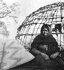 Basket weaver Alice Worris and her burden basket, ca. 1905, at the annual fish camp site on Upper Lake Shore (with framework for tule house behind her). Photograph by H.C. Meredith. |
